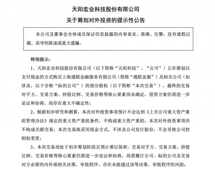 支付圈音书,近日,上市公司天阳宏业科技股份有限公司(以下简称“天阳科技”)发布公告称,公司正在霸术以支付现款的步地购买上海通联金融劳动有限公司(以下简称“通联金服”)及推断公司的部分股权。